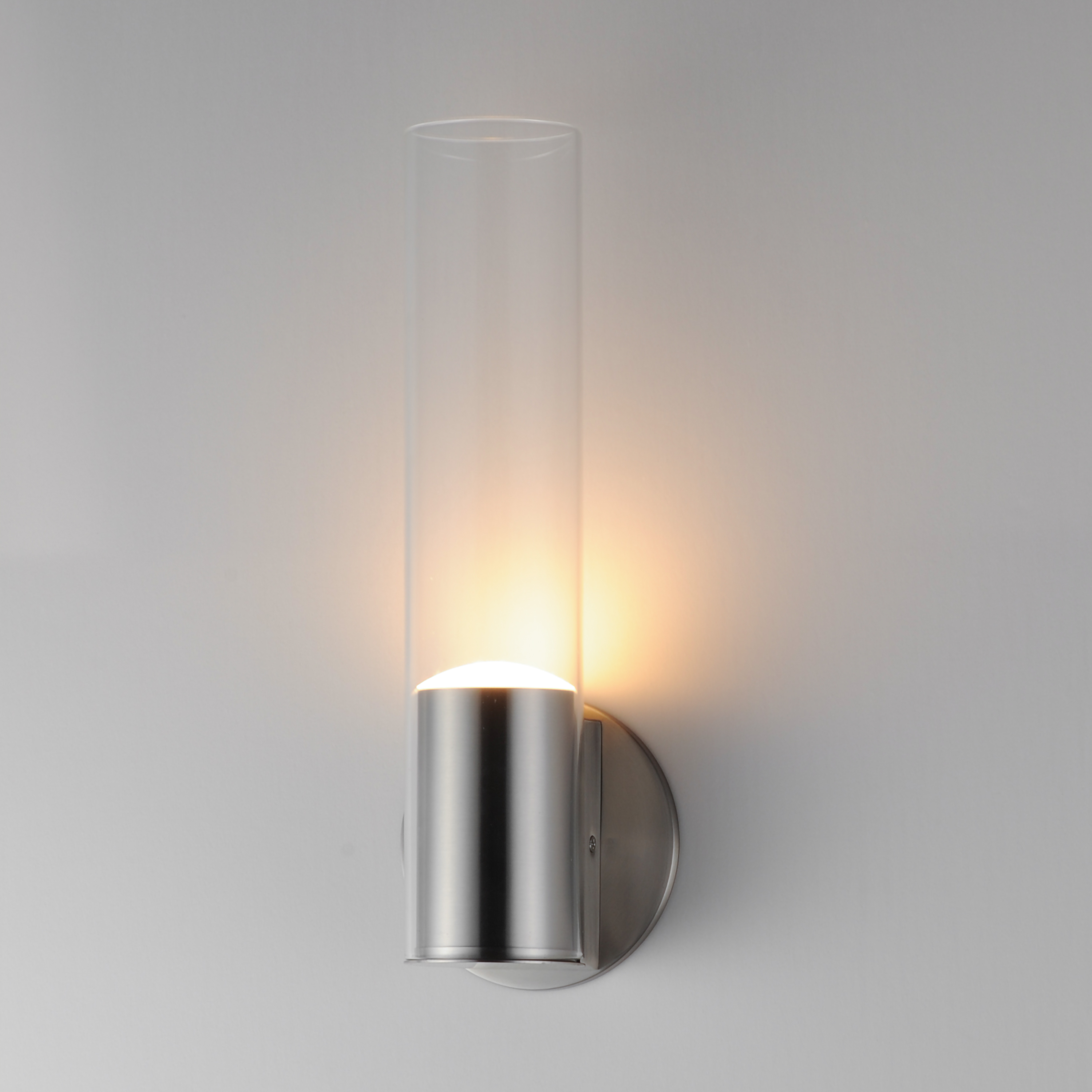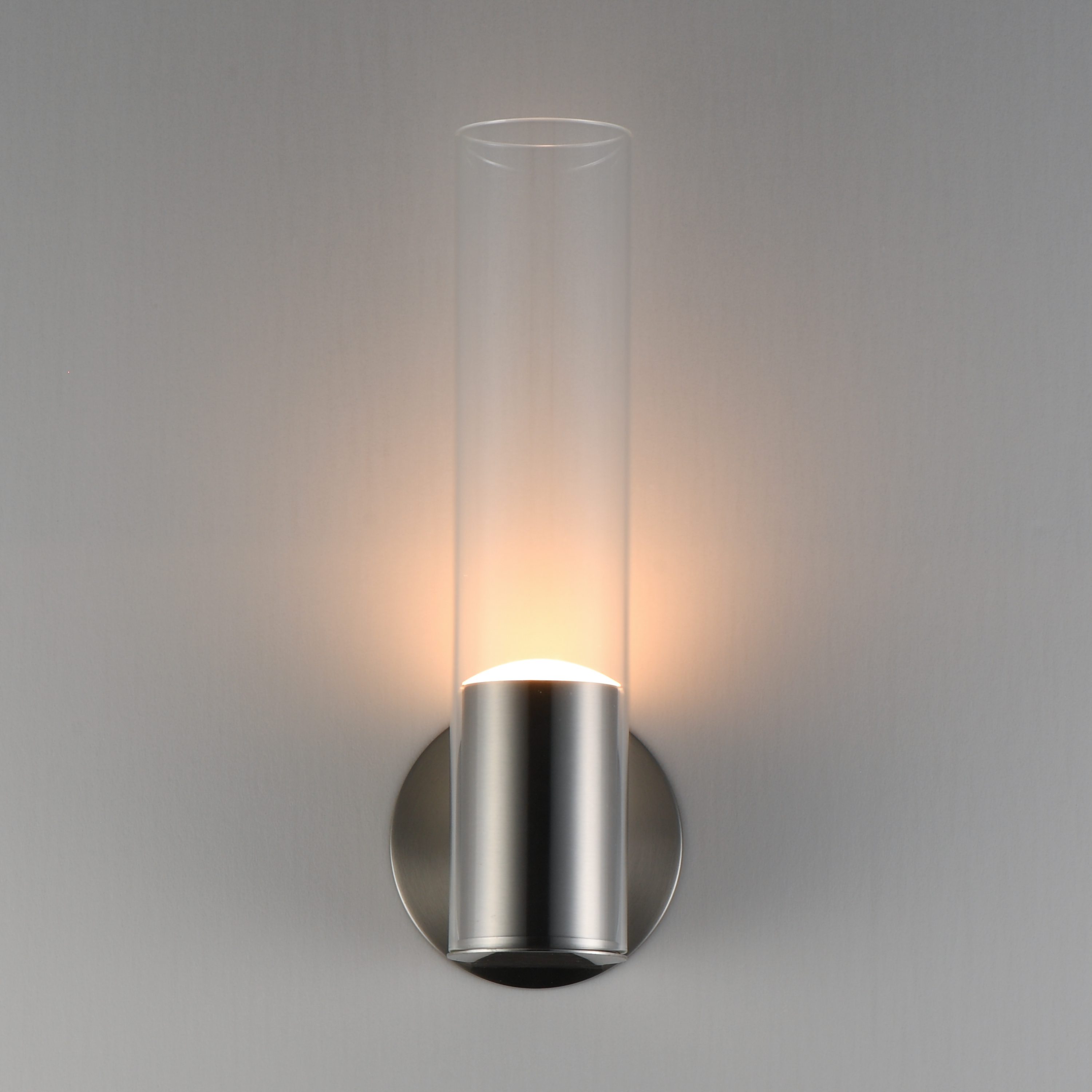 Minimalist in form and futuristic in styling, a gradient color effect applied to cylindrical glass shades provides a dynamic lighting effect. A Polished Gunmetal LED housing supports the glass adds a mirror like effect to the highly reflective glass. The resulting effect is a replication of the LED light along the length of the glass. Available in a mirrored Gradient Smoke or Gradient Amber glass, the finishes remarkably coordinate with many interior color palettes.