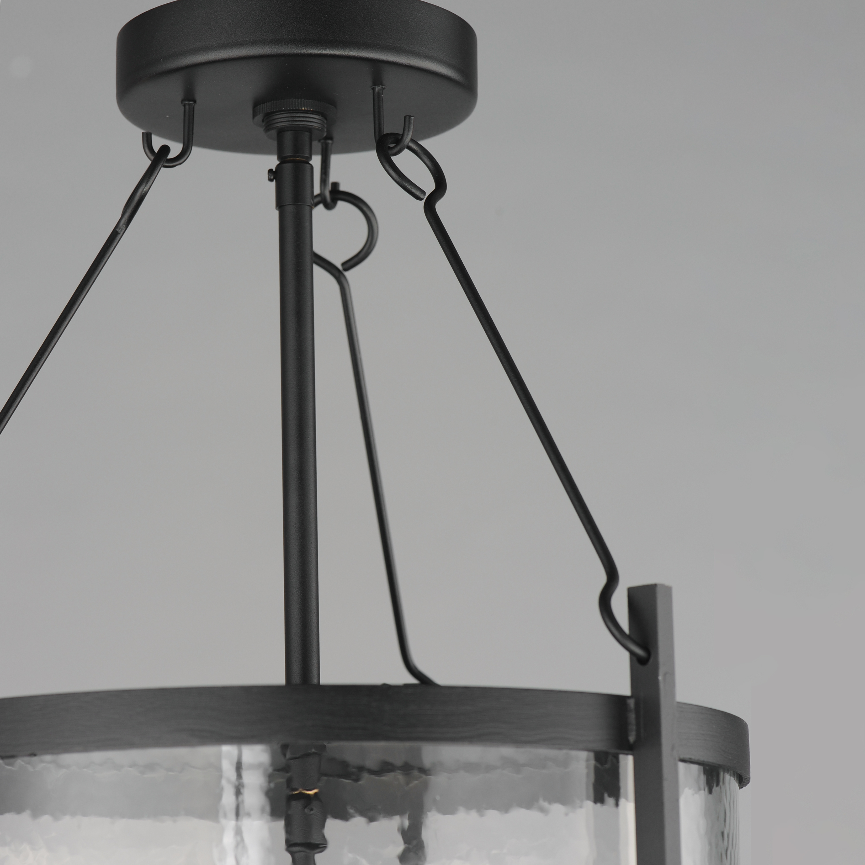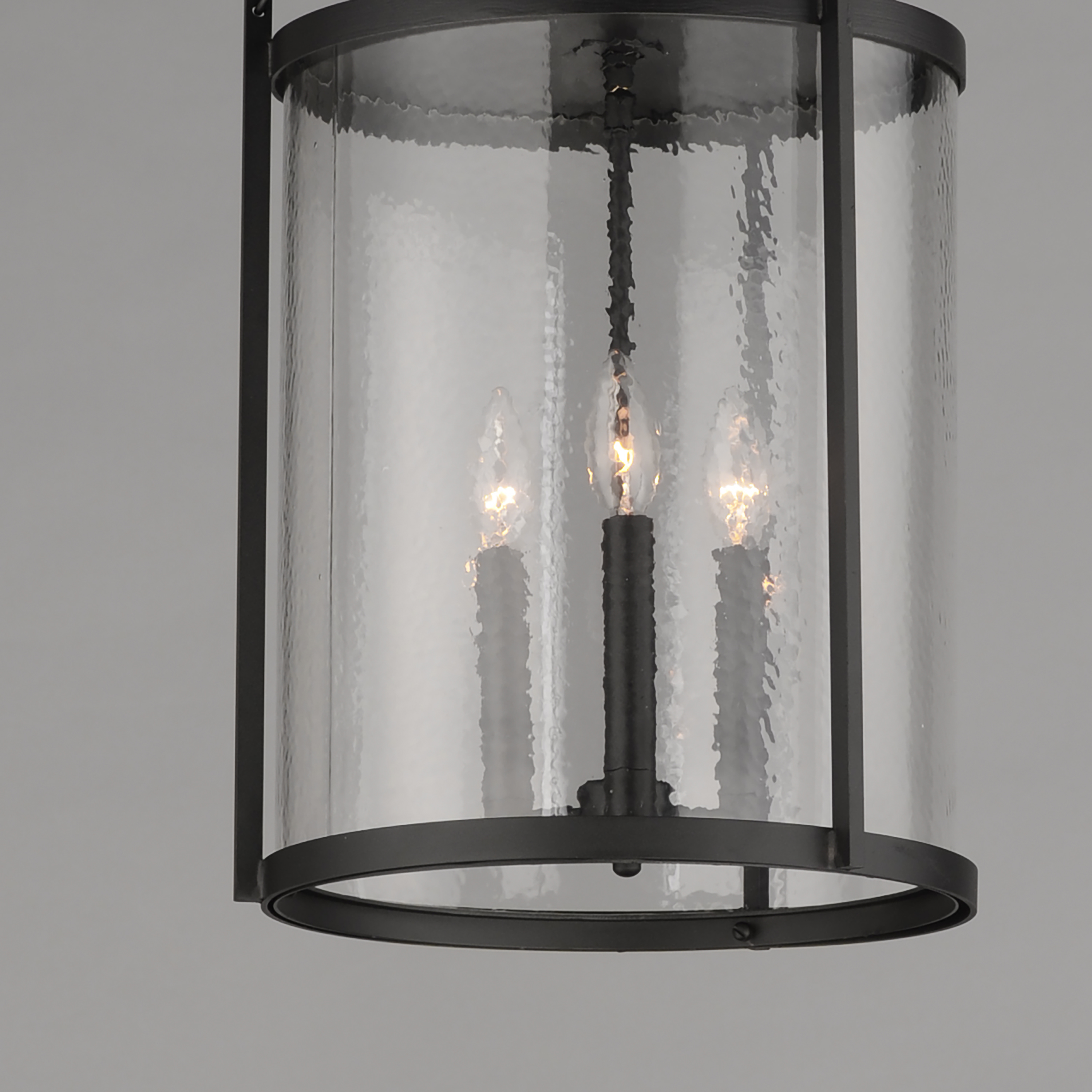 Squared columns in Matte Black finish tower above the cylindrical glass shade rated for outdoor applications. Available in a more modern clear glass option or hammered glass. A rectangular hook detail carries the square form through to the backplate. A modern interpretation of a bell tower, these outdoor pendants and sconces are a cleaned up, transitional look for exteriors.