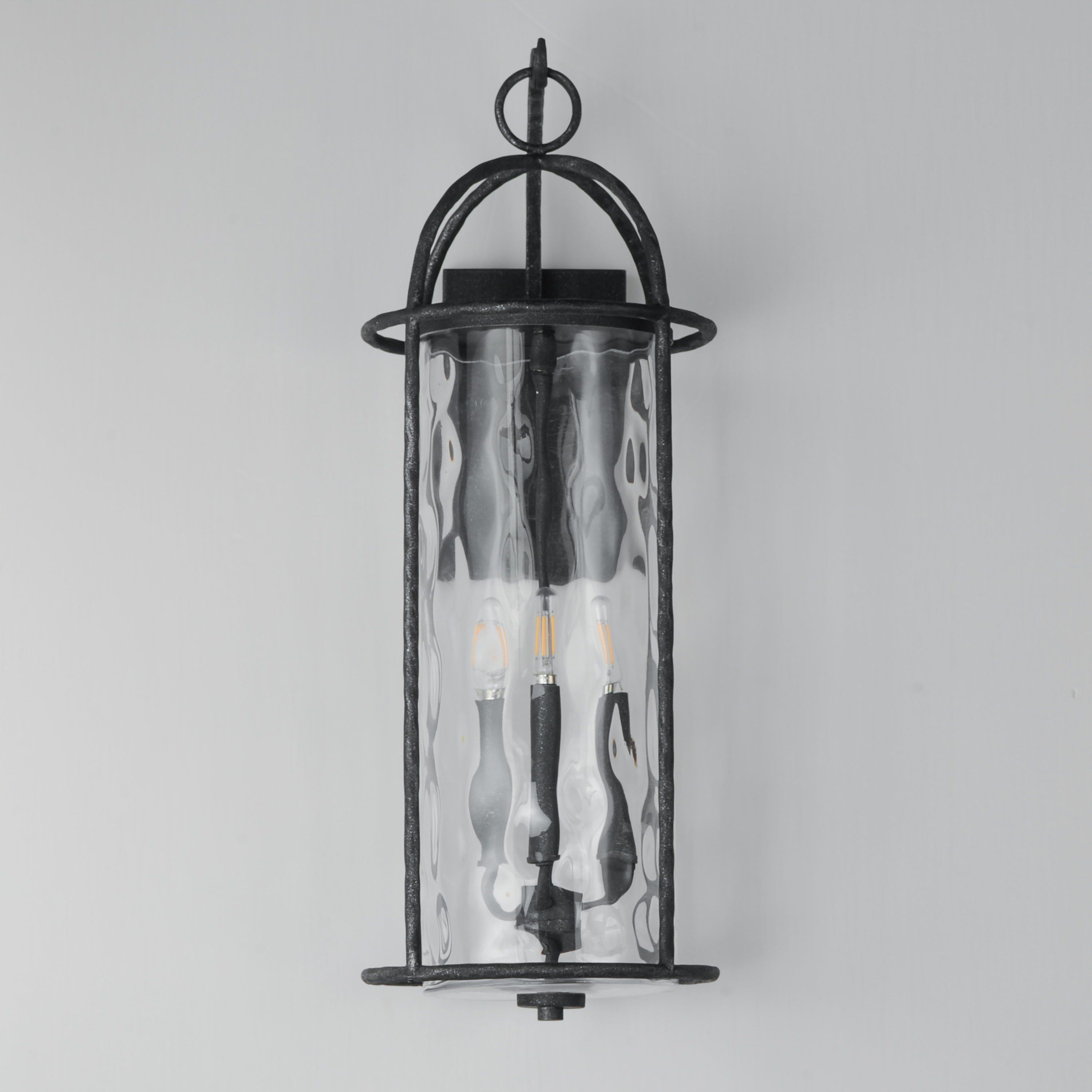 Inspired by classic European lanterns and handcrafted ironwork, the Del Mar collection brings timeless sophistication to exterior spaces. Its airy open-frame silhouette is crafted of hammered iron, elegantly arched with a graceful hook detail that nods to historic gas lamps. Inside the frame, a delicate Water glass cylinder shimmers with texture, diffusing light in a soft, atmospheric glow. Designed for lasting beauty in the elements, each piece is finished in a richly layered Blacksmith finish--a deep near-black tone highlighted by silvery brushstrokes, adding artisanal character to the silhouette. Whether flanking a grand entry or lining a garden path, Del Mar offers a refined approach to outdoor lighting with enduring presence.