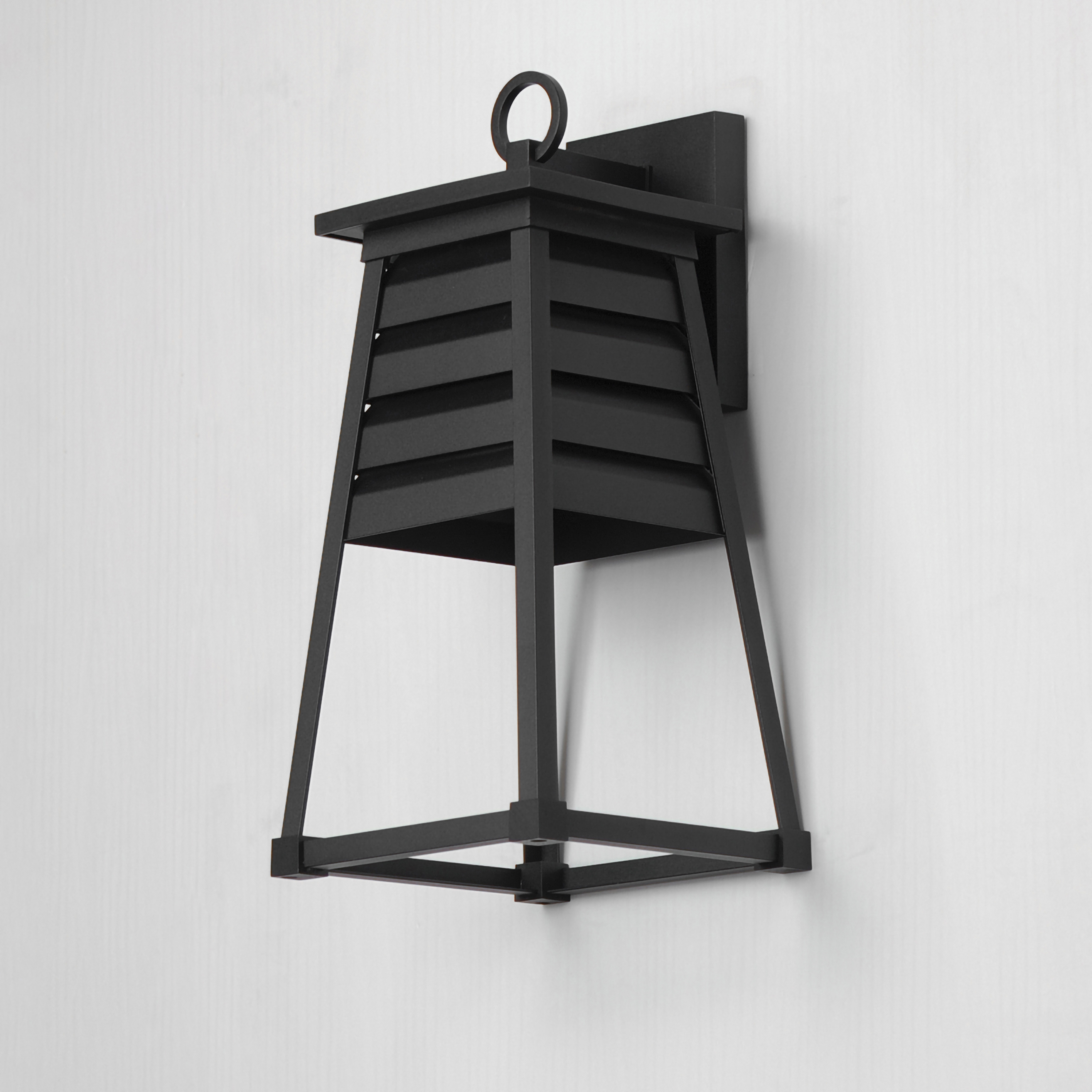 Contrasting louvered insets are set within Matte Black trapezoidal frames. The frames are made of Vivex so their finish will withstand harsher climates. The louvered panel insets are made of aluminum and feature a full cut-off design aesthetic making this design suitable for Dark Sky applications. An added benefit is the removal of glass altogether, adding a robust quality to the construction of the fixtures leading to longevity and lower maintenance. These wide plank louver panels complement the design's coastal styling adding interest in contrasting Weathered Zinc or White options, while the matte Black finish blends into the frame for a cleaner, more seamless approach.