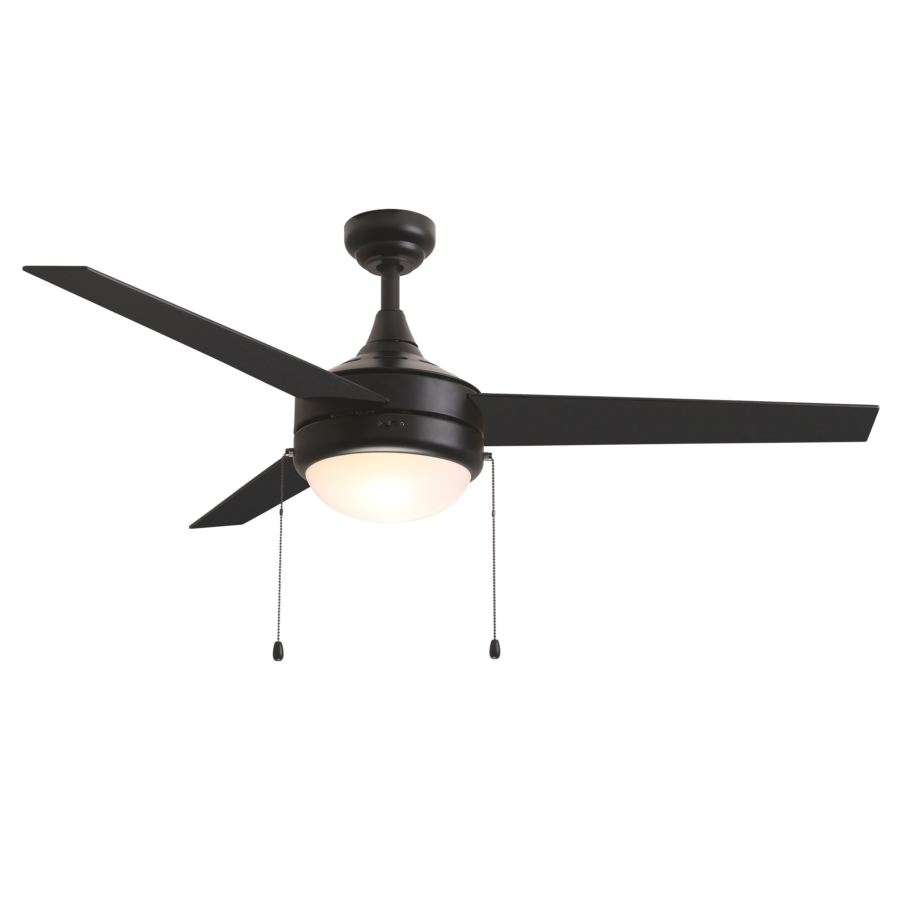A contemporary, yet transitional look at economical pricing, the Trio fan is finished in Satin Nickel with 3 straight fan blades in Black on one side and silver on the other side. The fan is powered by an included wall control or pull chain as well as LED JA8 compliant bulbs also included.