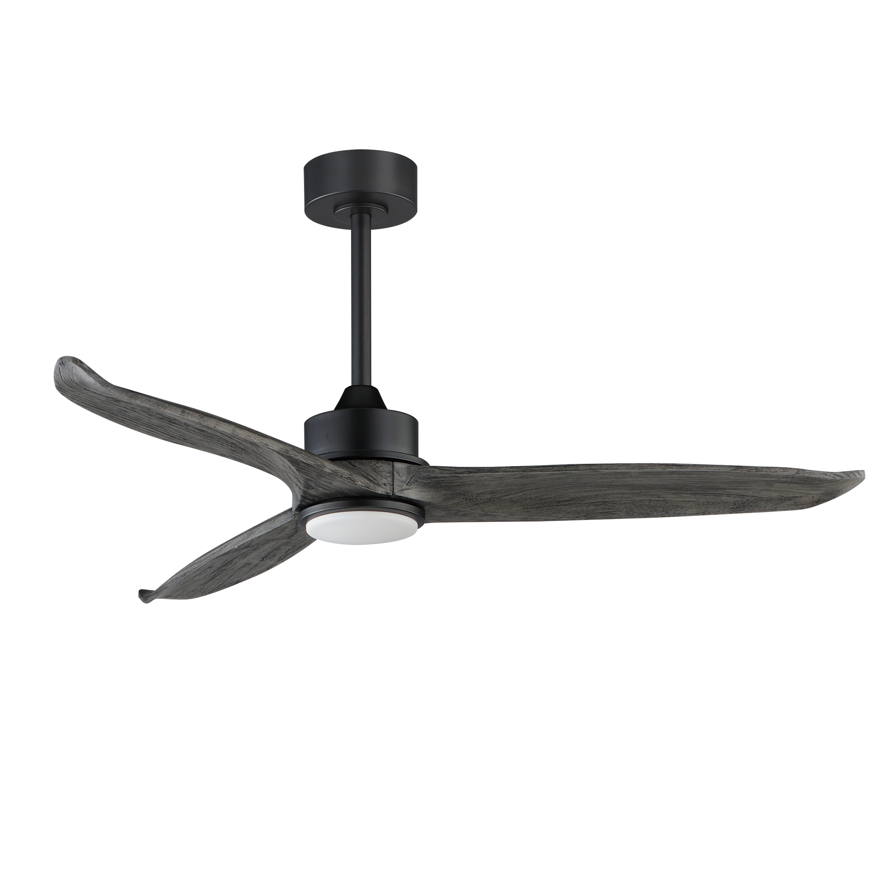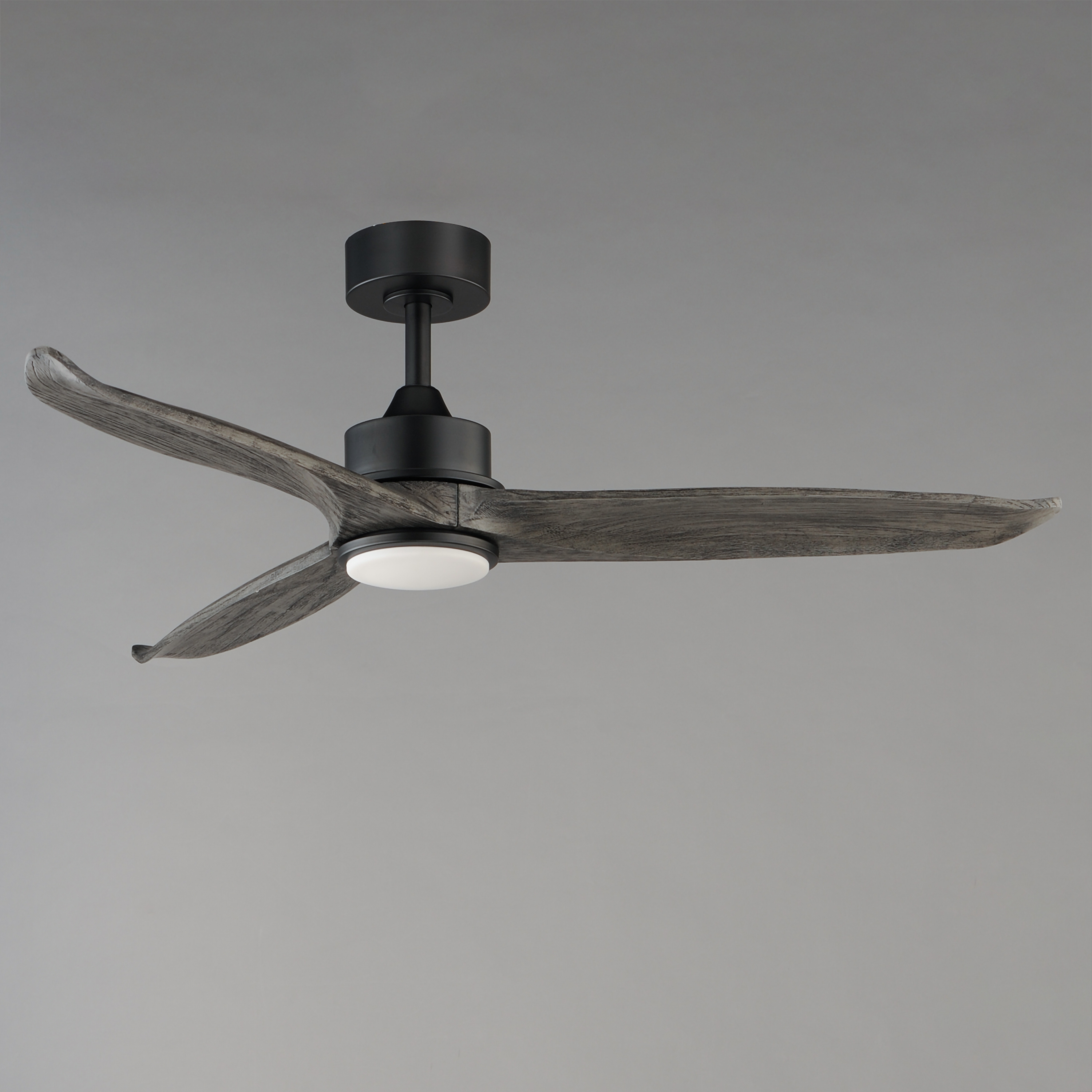 Solid Wood blades curve as they rotate around a center housing with LED light kit included. An additional cover plate is included if the light kit is not used. Select from stylish finish combinations including Natural Aged Brass with White Wood, Satin Nickel with Greywood, Black with Walnut wood, or Charcoal Bronze with Distressed Wood.